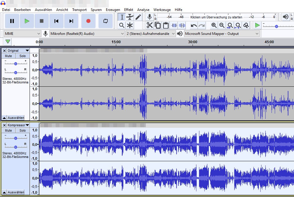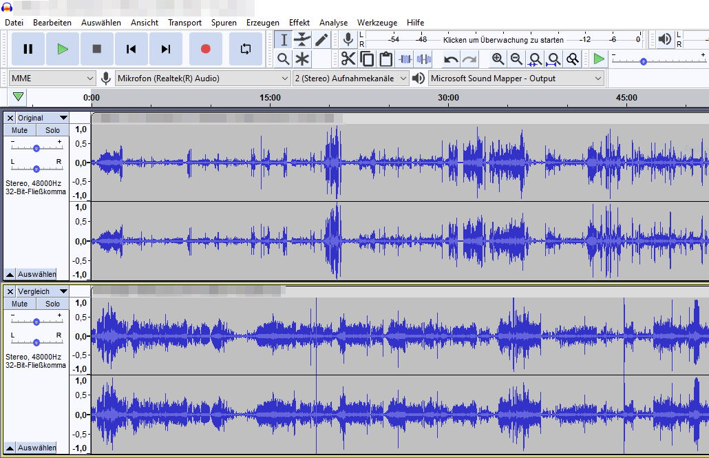 Die so extrahierte Tonspur kann in Audio-Editoren wie z.B. Audacity geöffnet bzw. importiert werden. Bevor man nun wild drauf los versucht die Lautstärke “auszubügeln” sollte man zuerst die Differenz zwischen den zu leisen und zu lauten Stellen ermitteln, für die weitere Bearbeitung ist dies durchaus relevant.
