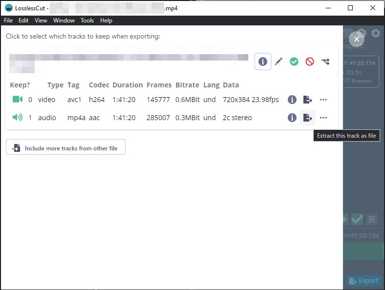 Sofern man das vorliegende Film-Material bearbeiten kann, lässt sich da durchaus (noch) etwas machen. Der erwähnte Film liegt als MP4 vor, d.h. die Video- und Ton-Spur kann einfach getrennt werden, dafür gibt es eine Vielzahl von De-/Muxer-Tools. An dieser Stelle kann man zu LosslessCut (GitHub) greifen. Nach einem Klick auf “Tracks” kann einfach die jeweilige Spur extrahiert werden:
