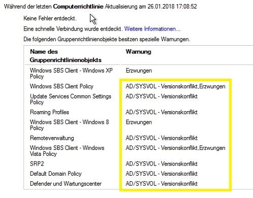 Ruft man in der Gruppenrichtlinienverwaltung (GPMC) das Gruppenrichtlinienergebnis für einen Computer ab, so sieht man in der Zusammenfassung das ein AD/SYSVOL Versionskonflikt angezeigt wird: