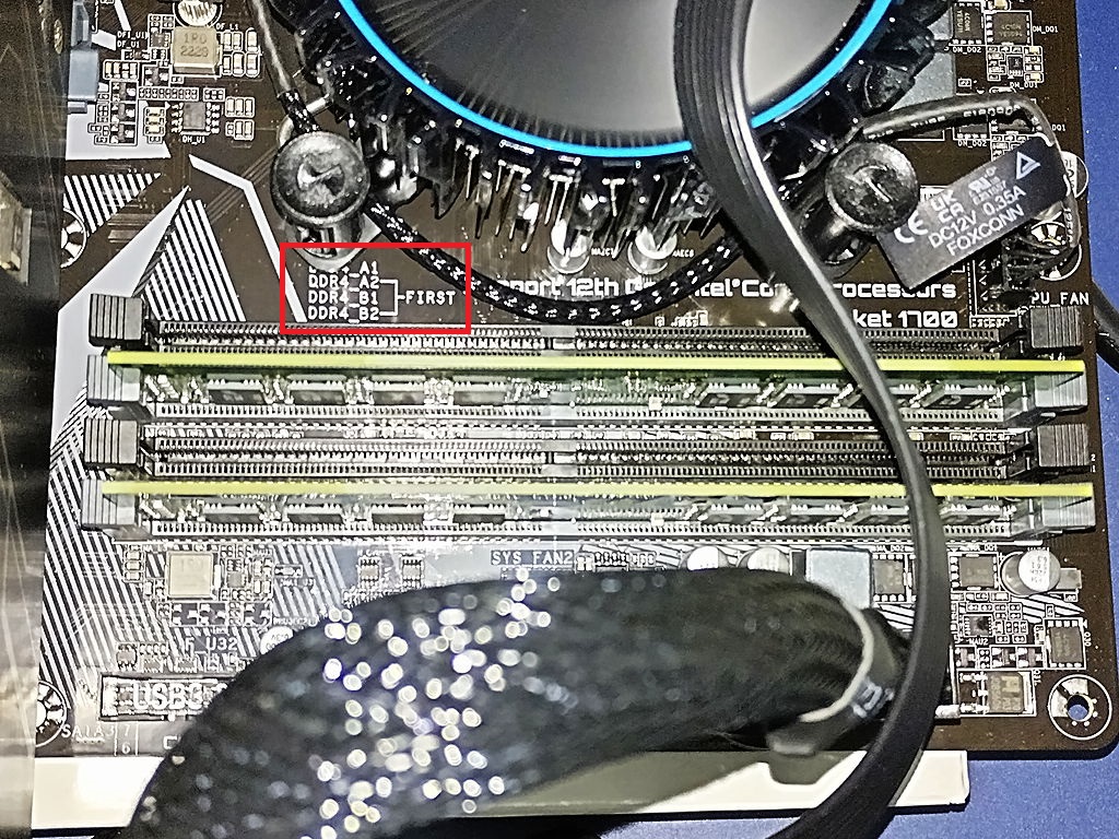 Dieses Mainboard hat insgesamt vier Steckplätze, hat man nur zwei Speicherriegel müssen die Slots DDR4_A2 und DDR4_B2 zuerst bestückt werden. Dies steht so im Handbuch und ist sogar auf dem Mainboard aufgedruckt: