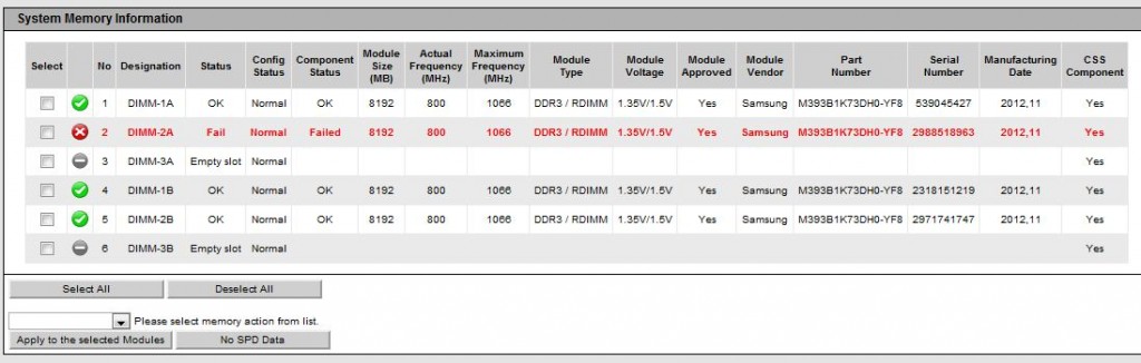 Auch unter “System Memory Information” bekommt man direkt angezeigt, wie der Stand der Dinge ist. So lässt sich gezielt das fehlerhafte Teil austauschen. Anhand der verfügbaren Informationen ist es sogar möglich, direkt beim Support oder Lieferanten das passende Ersatzteil zu beschaffen.