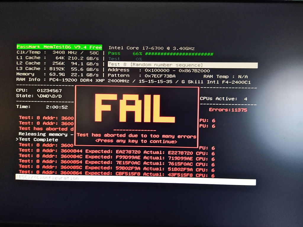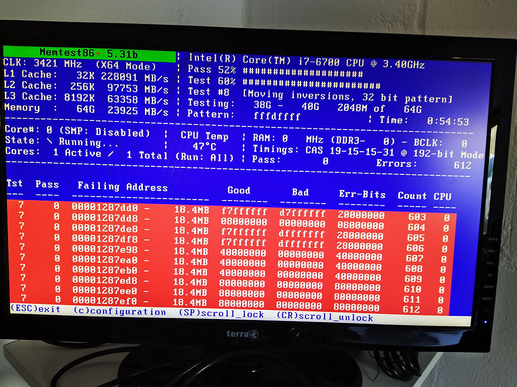 Zuerst wurde der alte Arbeitsspeicher, bei dem ohnehin ein Riegel bereits defekt war, ausgebaut. Im zweiten Schritt wurde der neue Arbeitsspeicher eingebaut und ein Speichertest mit MemTest86 und Memtest86+ durchgeführt. Leider zeigten sich dabei Fehler: