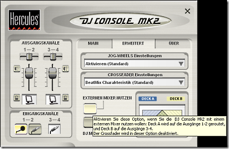 Diejenigen, die mit einem externen Mixer arbeiten und die Hercules DJ Console Mk2 nur als Dual-Player verwenden möchten, sollten auf die Registerkarte ERWEITERT wechseln und auf den Button EXTERNEN MIXER NUTZEN klicken. Auf diese Weise wird der erste Player auf die Ausgänge 1/2 und der zweite Player auf die Ausgänge 3/4 geroutet. Diese Ausgänge sind sowohl als Cinch als auch als 3.5 mm Miniklinke-Buchse ausgeführt. Das finde ich persönlich sehr praktisch und erhöht die Flexibilität. Das würde ich mir auch bei manch anderer Konsole auch wünschen, z.B. bei der BCD3000 von Behringer.