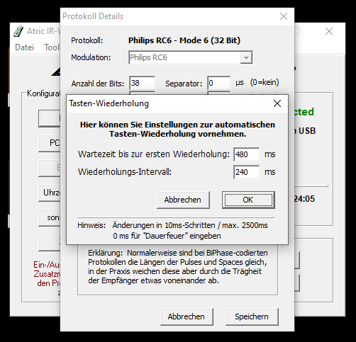 Mit Firmware 2.1 und Version 1.5 der atric-Software hat sich dank der Überarbeitung der Tasten-Anschlagserkennung die Reaktionsfreudigkeit der Fernbedienung stark verbessert. Sogar mit den Standard-Einstellungen fühlt es sich nun eher an wie bei einem klassischen HiFi-/TV-Gerät. Zudem gibt es nun hinter der Schaltflache “Tasten-Wiederholung” mehr Einstellungsmöglichkeiten: