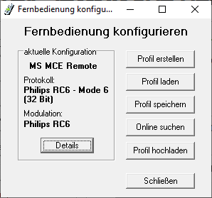 Wird die Fernbedienung unterstützt, kann mittels eines Klicks auf “Online suchen” ein passendes Profil ausgewählt werden. In meinem Fall handelt es sich um eine Hauppauge RC6. Seit dem Einsatz von Atric weiß ich nun, das diese von Philips gebaut wird.