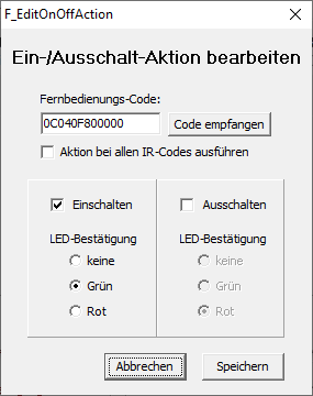 Zuerst klickt man auf “Hinzufügen” und drückt die gewünschte Taste auf der Fernbedienung. Als nächstes legt man fest ob mit dieser Taste ein- und/oder ausgeschaltet wird.