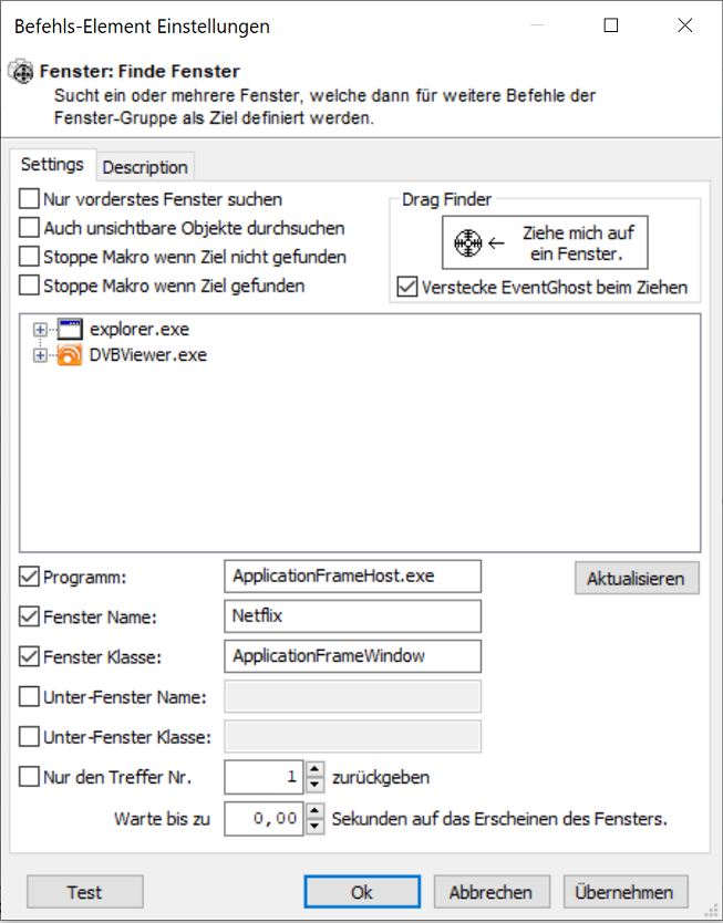 Die Funktion “Finde Fenster” ist per Vorgabe so konfiguriert, das sie das Makro stoppt, wenn das entsprechende Fenster nicht gefunden wird. Läuft nun wie in meinem Beispiel vorher nicht die Netflix-App gibt es ergo kein entsprechendes Fenster. Versucht man so dann den DVBViewer zu starten, wird dies bei “Finde Fenster” sozusagen abgebrochen.