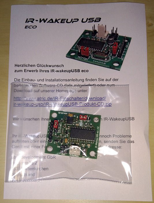 Eine universelle Lösung, die schlicht den Druck auf die Power-Taste simuliert findet sich in einer kleinen Zusatzplatine von atric in Form des IR-WakeupUSB eco.