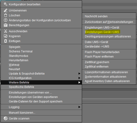 “Weitere Befehle” und “Einstellungen Gerät->UMS” auswählen. Dadurch werden die Einstellungen die auf dem Thin Client vorgenommen wurden auf den UMS übertragen.