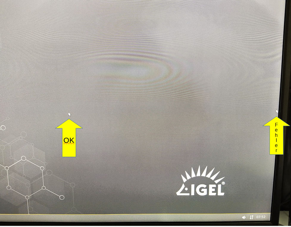 Anschließend wurden die Thin Clients ausgetauscht und provisioniert. Bereits beim ersten Gerät bzw. dessen Startvorgang (noch vor der Provisionierung) wunderte ich mich über die etwas seltsame Darstellung des Bootscreens, machte mir da allerdings noch keine Gedanken. Erst als der Desktop erschien, zu diesem Zeitpunkt war noch keine Sitzung irgendwie aufgebaut, stach mir ein zweiter Mauszeiger der am rechten Rand des ersten Displays festklebte ins Auge. Dieser lässt sich nicht bewegen und verschwindet auch nicht wenn z.B. eine Verbindung zu einem Terminalserver (RDP) aufgebaut wird.