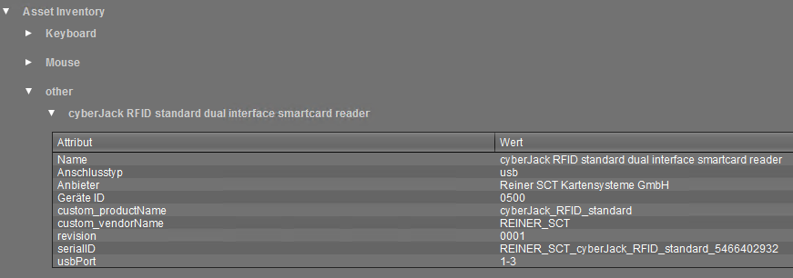 Zunächst sollte man prüfen, ob das Gerät richtig verbunden und USB-seitig korrekt erkannt wurde. Via UMS geht dies über “Geräte – <Thin Client> – Asset Inventory – other”: