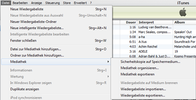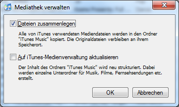 Auf dem Windows-PC iTunes starten und Datei-Mediathek-Mediathek organisieren anklicken.