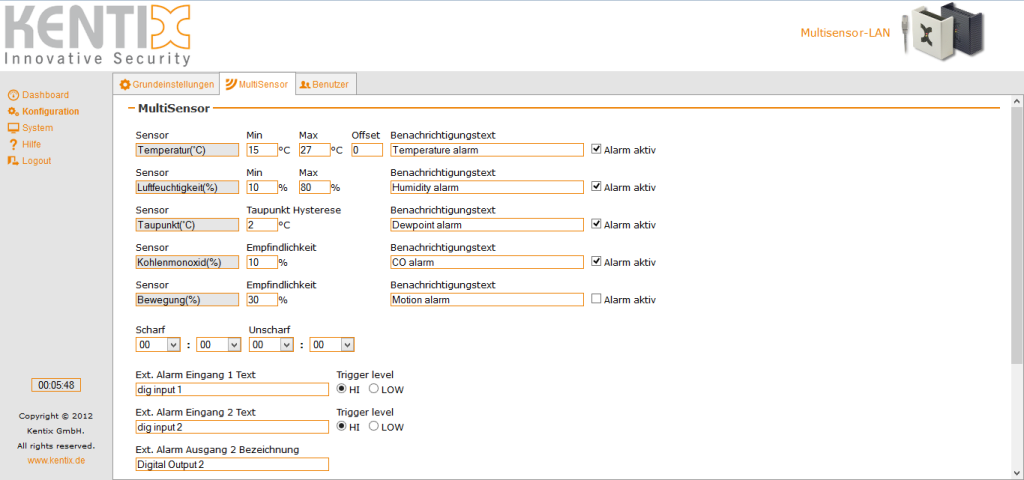 Die Konfiguration erfolgt ebenfalls über das Web-Interface und nach einer Anmelden. Auf mehreren übersichtlichen Seiten lassen sich zum einen die Parameter für das Netzwerk und die Alarmierung festlegen als auch die Schwellenwerte für die Sensoren und ein Zeitfenster definieren, in dem der Bewegungsmelder scharf geschaltet ist. Nimmt der Bewegungsmelder während dieses Zeitfenster eine Bewegung wahr, so ertönt ein akustisches Signal und erfolgt eine Alarmierung auf dem konfigurierten Weg.