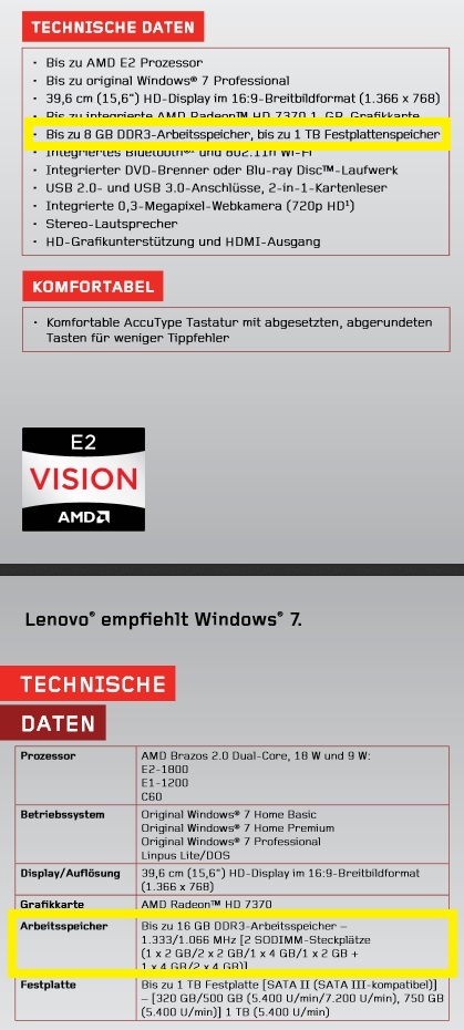 Das Datenblatt ist wohl noch fehlerhafter als zunächst gedacht. Ein Kollege wies darauf hin, das dieses Gerät nur einen SODIMM-Steckplatz hat, d.h. es kann nur ein Speicherriegel verbaut werden. Damit sind die angegebenen RAM-Kombinationen ebenfalls hinfällig.