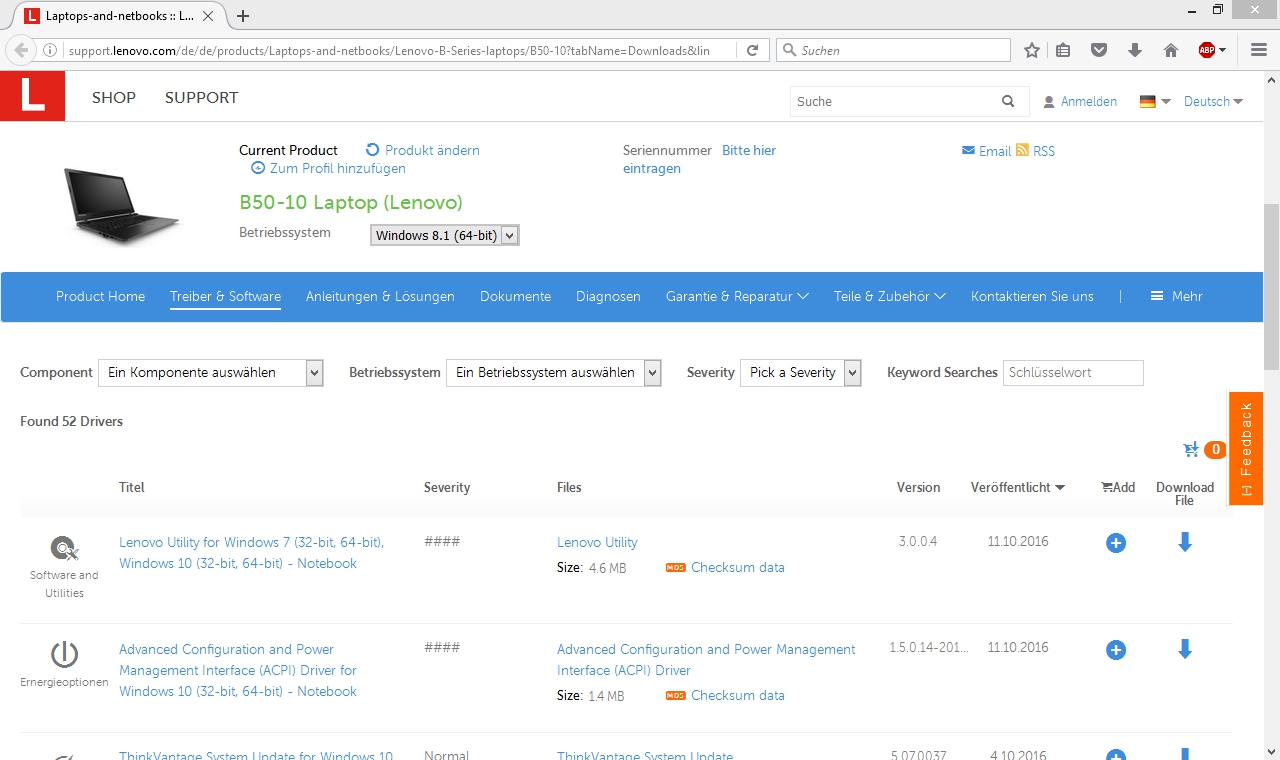 Windows 7 ansich bootete ohne Probleme, allerdings fehlten die Treiber für einige Geräte. Schaut man auf die Lenovo-Homepage kann man am Beispiel von diesem Gerät lediglich “Windows 8.1” auswählen. Lässt man die OS-Auswahl weg bzw. entfernt “Windows 8.1” aus dem Suchergebnis erscheinen die Windows 7-Treiber: