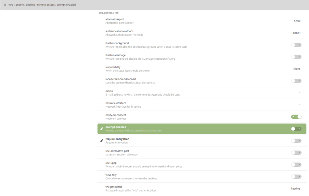 - Zu “org / gnome / desktop / remote-access” wechseln und die gewünschten Einstellungen vornehmen.