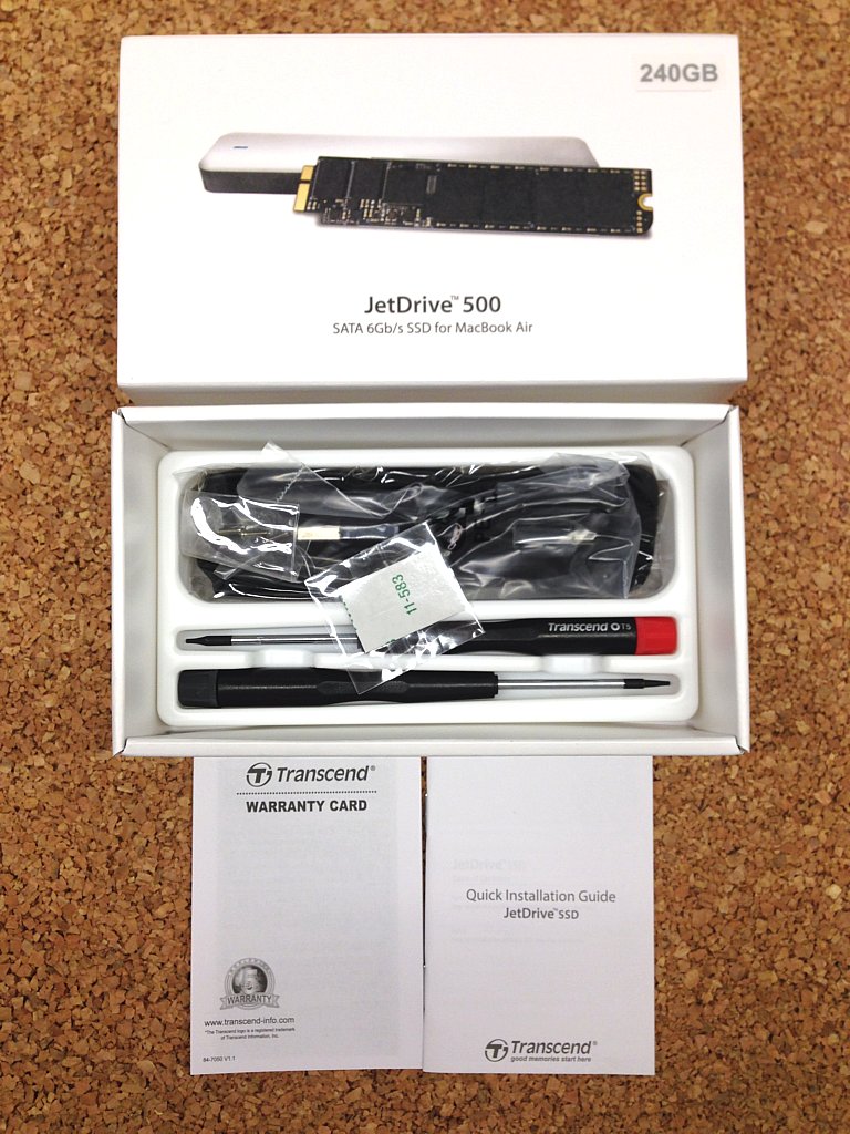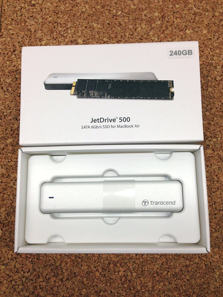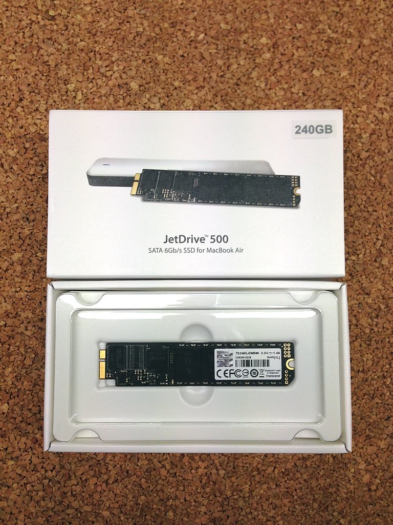 Apple verbaute in diesem Modell eine 60 GB SSD in einem propitären Format, allzuviel Auswahl bleibt folglich nicht. Die Wahl viel nach kurzer Recherche auf ein Transcend JetDrive 500 Upgrade Kit. Dort enthalten ist neben einer 240 GB SSD alles was man zum Umrüsten benötigt. Von Werkzeug über externes Gehäuse bis hin zur Anleitung ist alles dabei. Bei Amazon ist das Produkt aktuell (Stand: 16.04.2015) für knapp 170 € zu bekommen.