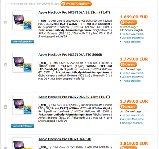 So wirklich weiter gekommen bin ich nicht. Mir scheint es so, das ein direkter Preisvergleich nicht möglich ist. Zwar bekommt man bei den gefundenen Geräten mehr Festplatten-Kapazität und die dreht auch noch schneller (zumindest beim MSI) aber das allein kann es ja nicht sein, oder?! So ein MacBook mit seinem Unibody-Gehäuse ist schon ein Gesamtkunstwerk. An der Verarbeitung kann man, so denke ich, auch nicht zweifeln. Der Preisunterschied ist schon gegeben. Die technischen Unterschiede aber auch. Also was tun sprach Zeus?! Die Suche geht weiter.