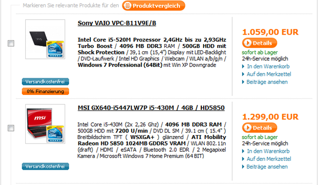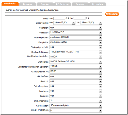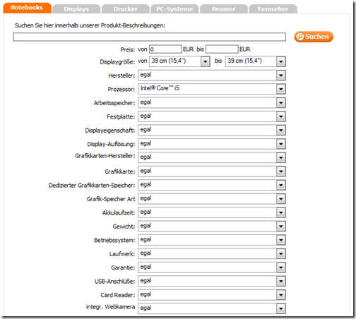 Aber nun zurück zum Thema. Mein Versuch beruht darauf, heraus zu finden, wie viel ein gleichwertiges Gerät aus beiden Lagern kostet. Als Hilfsmittel habe ich die Suchfunktion von notebooksbilliger.de herangezogen, da man hier viele Kriterien angeben kann und die Auswahl sehr groß ist.