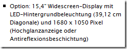 Da ich mit spiegelnden Displays auf Kriegsfuß stehe, spielt es eine Rolle, ob man die Option hat ein mattes Display zu bekommen. Bei Apple besteht die Option ab dem 15” MacBook Pro. Das kostet zwar um die 135 € Aufpreis, dafür erhält man dann aber auch eine höhere Auflösung: