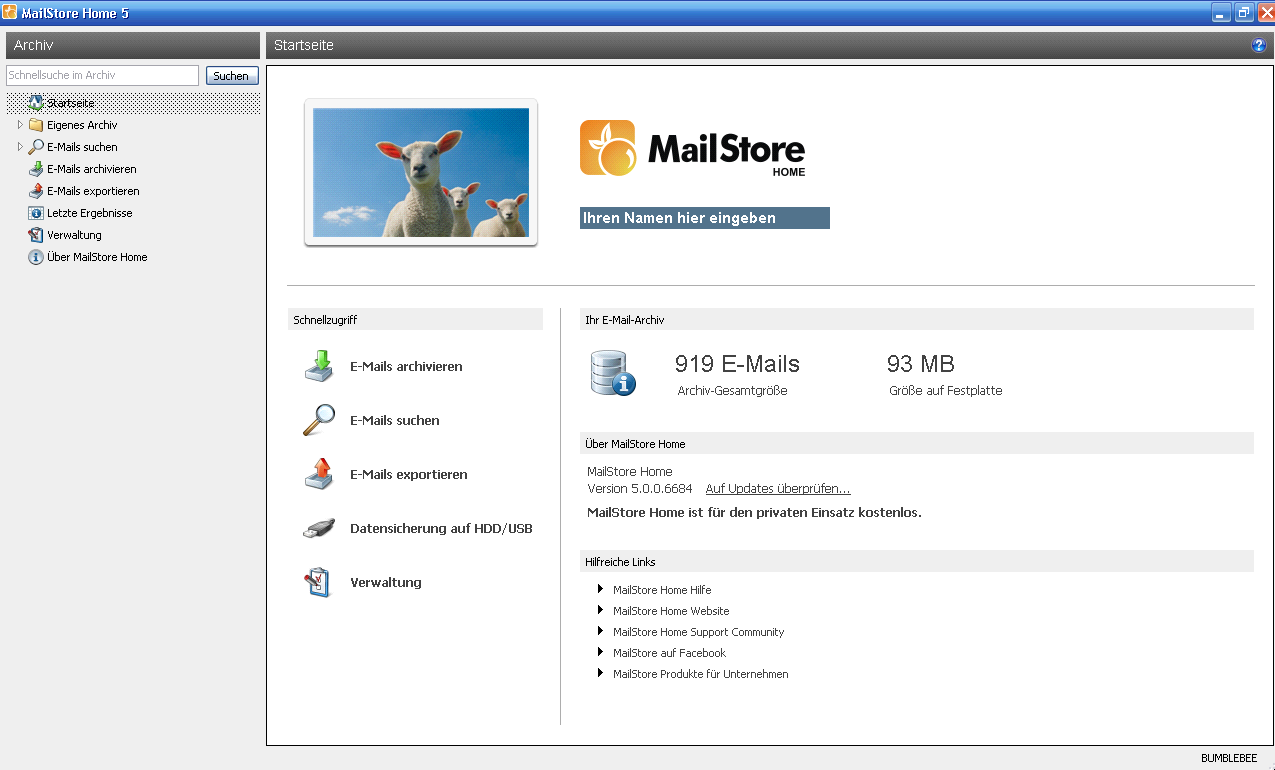 Nach dem Start von MailStore Home begrüsst einen die neue Oberfläche. Den Profis dürfte Diese schon vom MailStore Server bekannt sein.