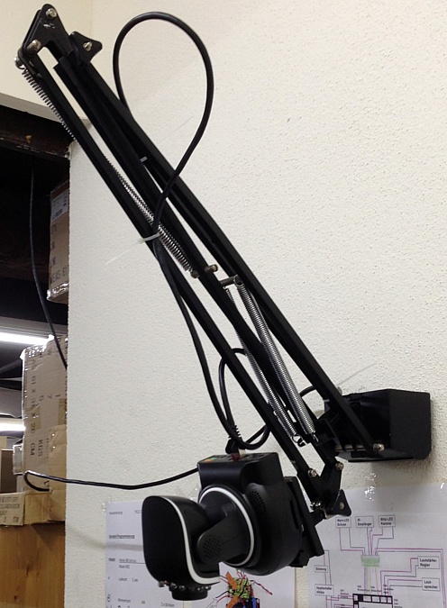 Damit man die Kamera nicht jedensmal direkt in die Hand nehmen oder schlimmer noch, die ganze Zeit festhalten muss, sollte eine entsprechende Halterung her. Wir hatten noch von einer ehemaligen (defekten) Lupenleuchte den Arm im Keller liegen, der zwischenzeitlich auch schon mal als Mikrofonarm herhalten musste.
