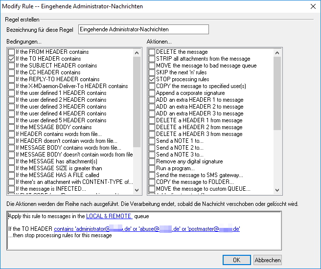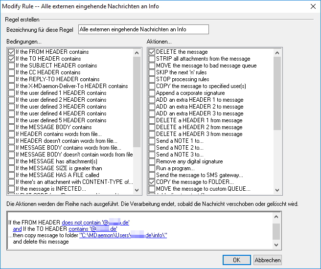 - Bei “Bedingungen…” “If the FROM HEADER” contains” und “IF the TO HEADER contains” anklicken.