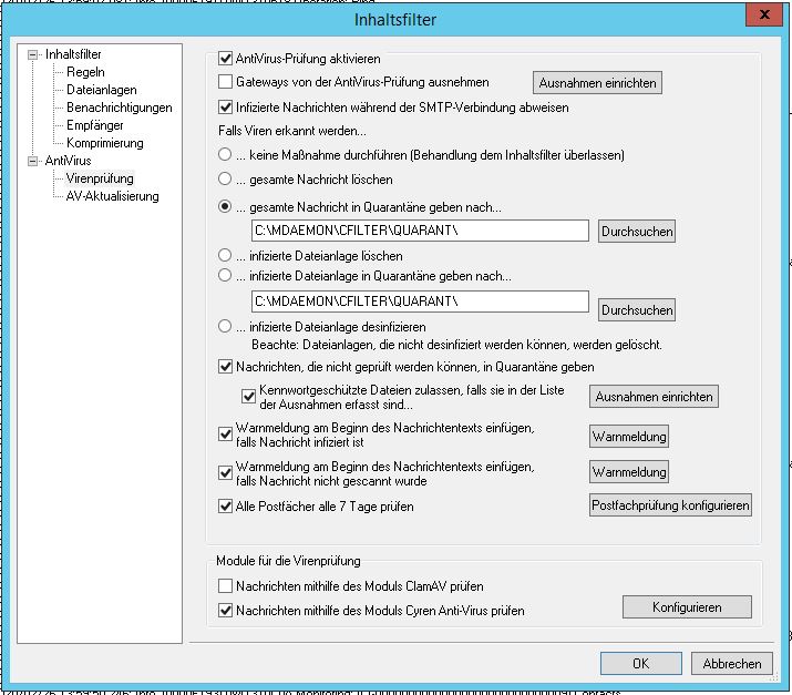 - Bei “AntiVirus – Virenprüfung” in “Module für die Virenprüfung” den Haken entfernen bei “Nachrichten mit Hilfe des Moduls ClamAV prüfen”.