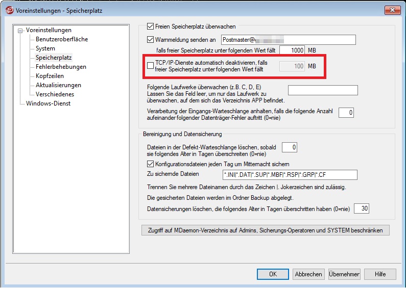 Der MDaemon Email Server kann den freien Speicherplatz des genutzten Laufwerks überwachen und beim unterschreiten des Schwellenwerts bestimmte Dienste deaktivieren um ein Vollschreiben des Laufwerks und so Schwierigkeiten mit Windows oder gar Datenverlust zu vermeiden.