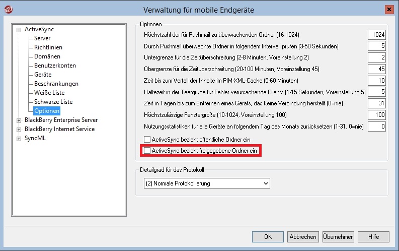 Abhilfe schafft das Deaktivieren des Einbeziehens von freigegebenen Ordnern unter “Einstellungen – Verwaltung für mobile Endgeräte… – ActiveSync – Optionen”:
