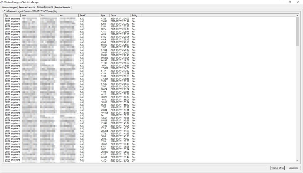 Zu beachten ist, das auch zunächst wegen Greylisting abgelehnte Zustellungen als Fehlschlag gelten. Ferner steht die Protokollübersicht nur für SMTP-, IMAP- und POP3-Protokolle zur Verfügung, alle Anderen können im Editor (Notepad) geöffnet werden.
