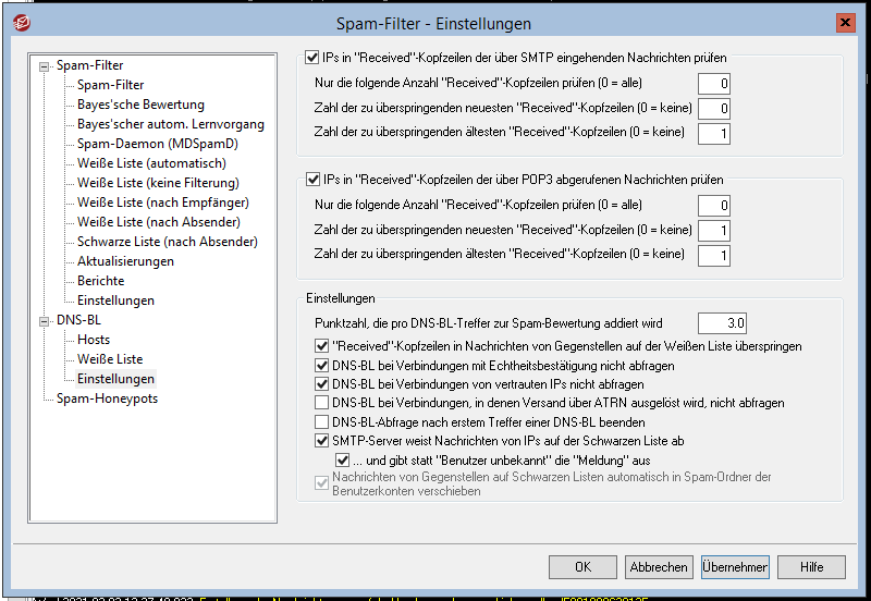 - Den Haken setzen bei ‘IPs in “Received”-Kopfzeilen der über POP3 abgerufenen Nachrichten prüfen’.