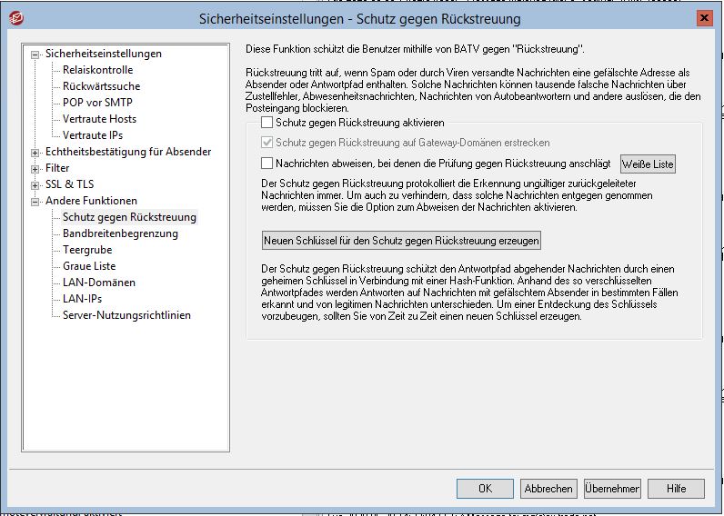 Der MDaemon Messaging Server bringt allerdings mit der Funktion Schutz vor Rückstreuung eine gute Möglichkeit mit, auch dieses Problem anzugehen. Unter “Sicherheit – Sicherheitseinstellungen – Andere Funktionen” befindet sich der Konfigurationsdialog:
