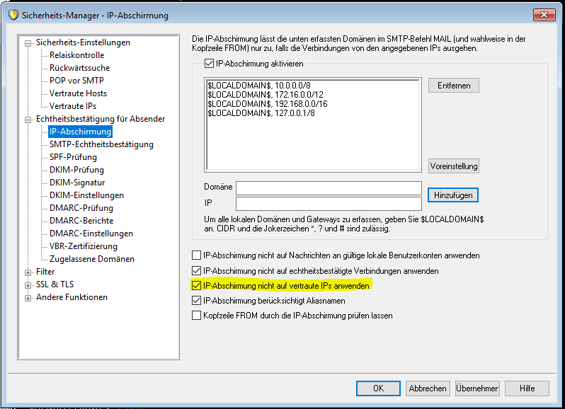 Einstellungen - Sicherheits-Manager - Sicherheits-Einstellungen - Echtheitsbestätigung für Absender - IP-Abschirmung - IP-Abschirmung nicht auf vertraute IPs anwenden