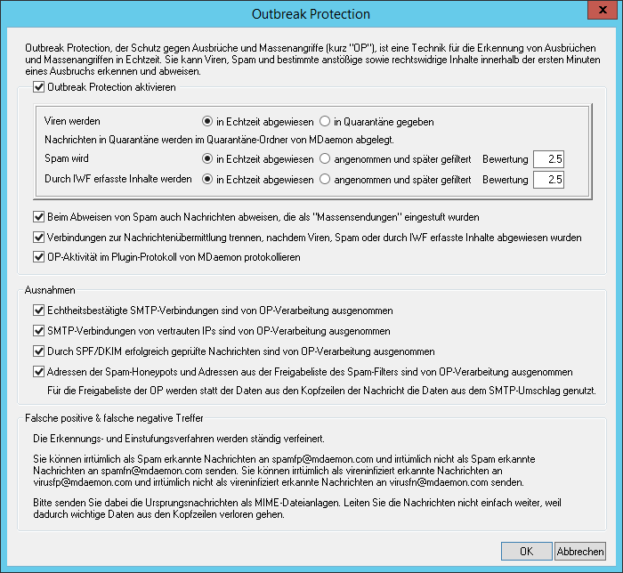 Bis auf weiteres bzw. bis eine Alternative gefunden wurde entfällt die “Outbreak Protection”. Der Menüpunkt “Sicherheit – Outbreak Protection” und das nachfolgende Fenster sind nicht mehr vorhanden: