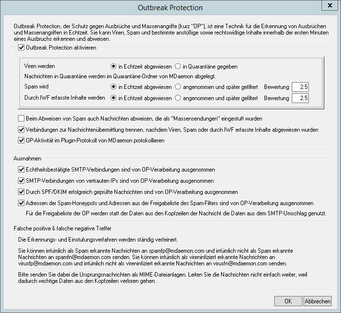 In Version 23.0.1 musste die Outbreak Protection aufgrund der Einstellung des Geschäftsbetriebs von Cyren noch bzw. vorübergehend ersatzlos entfernt werden, so ist dies mit der neuen Version hinfällig: