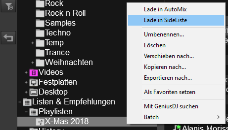 Vorhandene Playlisten kann man durch einen Rechtsklick und “Lade in Sideliste” bzw. “Lade in AutoMix” entsprechend laden. Dies ist ein bequemes Hilfsmittel für jede Art von vorbereitetem Set.