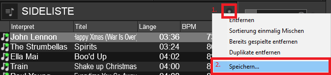 Diese Wege führen zum gleichen Ergebnis. Anschließend die gewünschten Titel in die Playlist/Sidelist(e) oder den Automix schieben und nach BPM sortieren lassen. Playlisten werden automatisch gespeichert, Sidelist(e) und Automix hingegen muss man manuell speichern. Dazu auf “SIDELIST OPTIONS” bzw. “AUTOMIX OPTIONS” klicken und “Speichern…” auswählen.