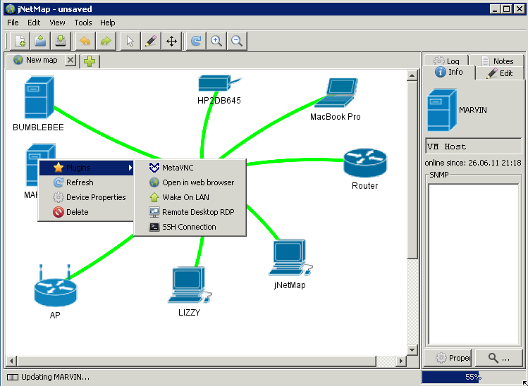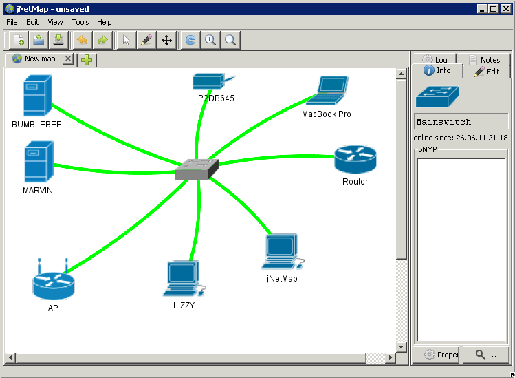Nach dem ersten Scan und ein wenig Nacharbeit (Verschieben, Symbole anpassen, Bemerkung hinzufügen, etc.) zeigt sich die Map wie im Screenshot zu sehen ist. Wie man an den grünen Linien erkennen kann, sind diese Verbindungen in Ordnung. Für jedes Device können zusätzliche Angaben gemacht werden.