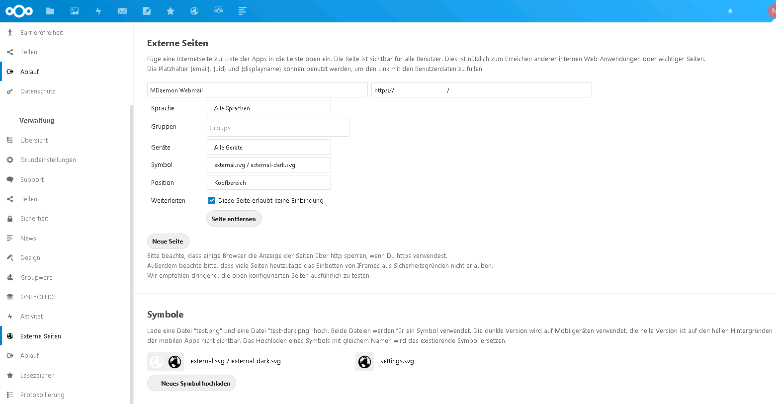 Pro Seite kann ein eigenes Symbol (Icon) vergeben werden, dies hilft bei der Unterscheidung. Ferner kann festgelegt werden, ob die Seite eingebunden (eingebettet, embed) wird, also wenn möglich innerhalb von Nextcloud die Seite dargestellt wird oder ob diese direkt aufgerufen werden soll. Nicht jede Seite erlaubt es oder funktioniert wenn sie eingebettet wird.