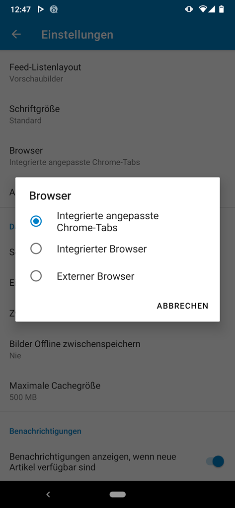 Per Voreinstellung werden Links in der Nextcloud-News-App unter Android mit Chrome(-Tabs) geöffnet. Das ist zwar einfach, aber leider erhält man so auch jede Menge Werbung sofern die Ziel-Seite entsprechend “verseucht” ist. Auf meinem Smartphone verwende ich kein Chrome, sondern Brave. Allerdings hatte ich kein Glück mit dem Ändern des Verhaltens: