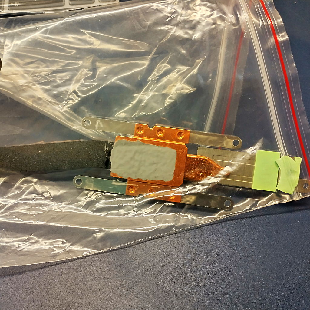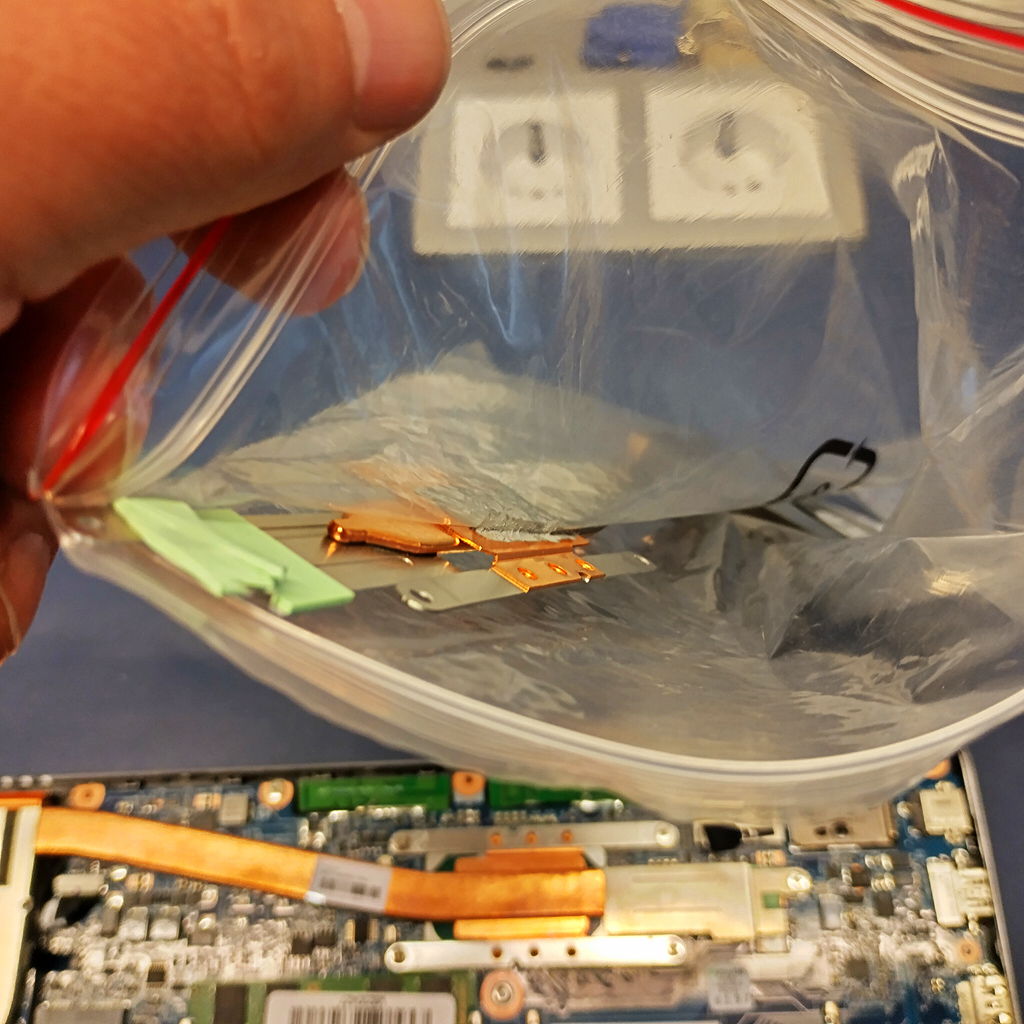 Beim Auspacken dann das: Auf der Heatpipe ist bereits Wärmeleitpaste aufgetragen und das Ganze in einer Plastiktüte verpackt. Unglücklicherweise klebte das dann an der Tüte fest. Seht selbst: