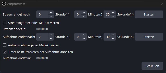 Einfach im OBS Studio auf “Werkzeuge – Ausgabetimer” klicken. Die gewünschte Dauer eintragen und auf “Starten” klicken.