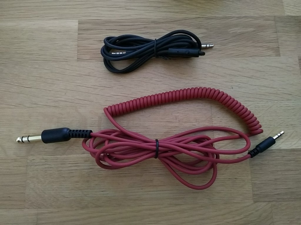 Mit den beiden Anschlusskabel hat man somit freie Anschlusswahl. Das eine Kabel ist ein Adapter-Kabel von 6.3 mm auf 3.5 mm Stereo-Klinkestecke und kann in beide Richtung (zum Kopfhörer hin, vom Kopfhörer weg) verwendet werden kann. Beim zweiten Kabel befinden sich an beiden Enden ein 3.5 mm-Klinkenstecker, ferner ist ein Mikro samt Mute-Taste integriert, d.h. mit Hilfe diese Kabels kann der Kopfhörer als Headset benutzt werden.