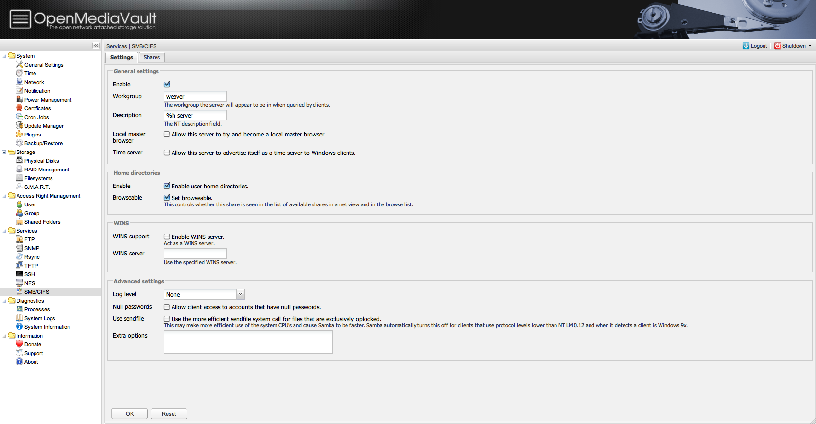 Seit Update 0.2.4.6 sind in OpenMediaVault per Standard die Home-Verzeichnisse von SMB/CIFS deaktiviert. Möchte man die Home-Verzeichnisse der Benutzer aktivieren, so muss man lediglich unter “Services – SMB/CIFS” im Abschnitt “Home directories” den Haken bei “Enable” setzen und auf den Button “OK” klicken.