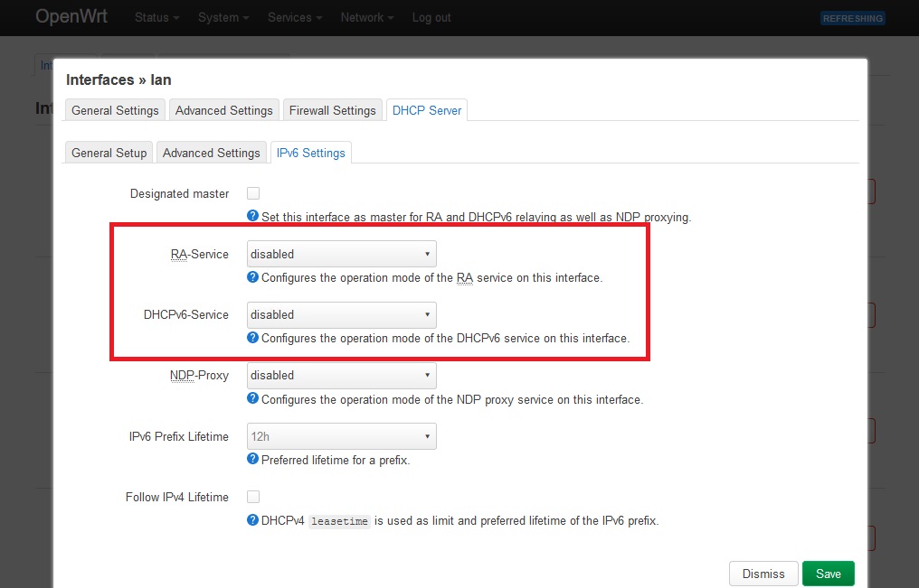 - Dort “RA-Service” und “DHCPv6-Service” von “server mode” auf “disabled” setzen und die Änderungen übernehmen.