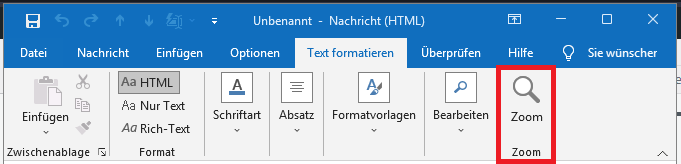 Neben der genannten Kombination kann man nach einem Klick auf die Schaltfläche “Zoom” (zu finden z.B. beim Verfassen einer neue Nachricht unter “Text formatieren”, i.d.R. rechts hinten) den Wert ändern: