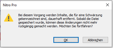 Nach einem Klick auf “Alle Schwärzungen anwenden” erscheint noch ein Hinweis, das die Auswahl aus der PDF-Datei sicher entfernt wird und man nach dem Speichern keine Möglichkeit mehr hat, die geschwärzten Inhalte wiederherzustellen. An dieser Stelle der Tipp, sowohl die Original-Datei als auch die bearbeitete Fassung mit verschiedenen Namen zu speichern.