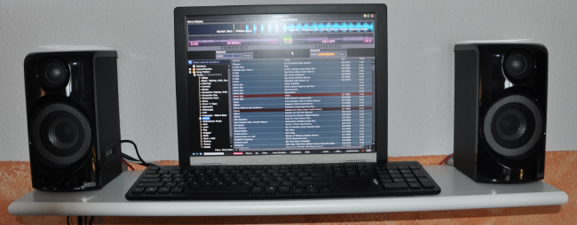 Wenn man sich das Foto näher betrachtet, dann stellt man fest, dass das Wandregal nicht allzu Tief ist. Ferner ist direkt hinter der Tastatur bereits das TFT an der Wand bzw. dem Regal montiert. Die Anforderung meinerseits bestand darin, eine Tastatur mit Touchpad zu finden, die dort genau hinpasst und mir die Bedienung erleichtert. Vorher hatte ich eine alte FSC-Tastatur dort stehen, die zum einen über das Regal hinaus ragte und zum anderen war das Problem, das ich die Maus nirgends unterbringen konnte. Bei vier Decks (2x Plattenspieler, 2x CD-Player) + Mixer durchaus ein Problem.