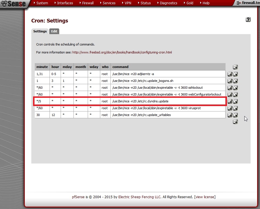 Leider ist es in der Voreinstellung so, das die automatische Prüfung bzw. Update per Cronjob nur einmal täglich um 01:01 Uhr ausgeführt wird. Abhilfe schafft das Ändern des Cronjobs. Am einfachsten geht dies mit dem installierten Package “Cron” das unter “Services – Cron” die Konfiguration zur Verfügung stellt: